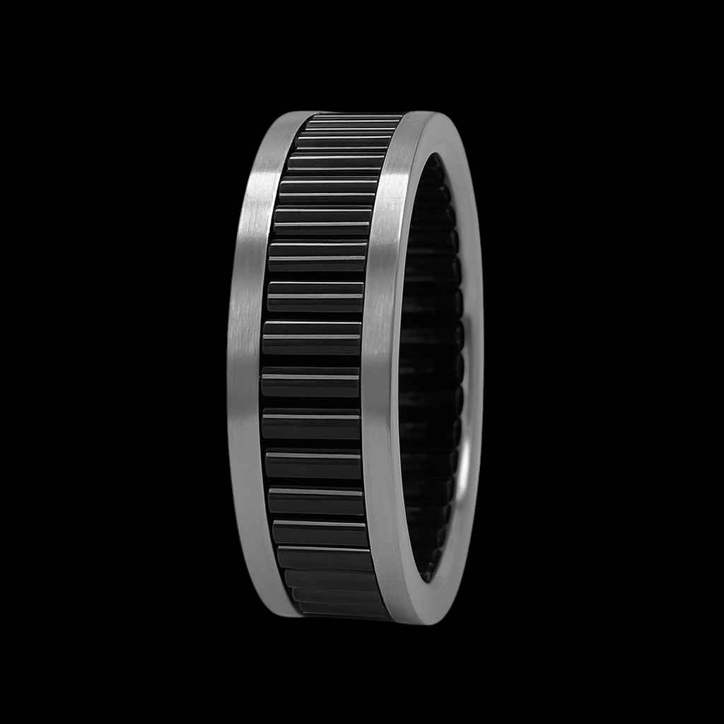 Crafted for the modern man, this ring is not only stylish but also built to last. Its rugged yet sophisticated look makes it a timeless accessory that complements any outfit, from everyday street wear to tailored suits. This men’s stainless-steel ring combines modern design with industrial strength. The brushed silver outer edges frame a bold black round enridged barrels inlay, creating a striking contrast that stands out with confidence and style.
