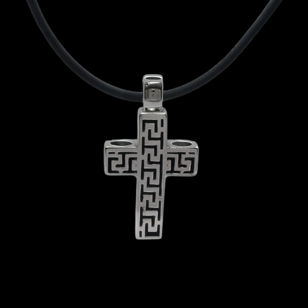 A bold expression of strength and heritage, this cross pendant from the hotseel Collection is crafted from marine grade 316 stainless steel, ensuring durability and long lasting shine. The pendant features an intricately engraved Greek key pattern, symbolizing eternity and unity a timeless design that merges classic artistry with modern masculine style. Suspended on a sleek black rubber cord, this piece is both elegant and versatile, perfect for daily wear or special occasions.