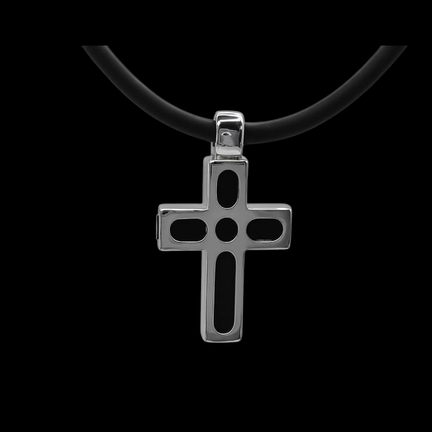 A bold expression of strength and heritage, this cross pendant from the hotseel Collection is crafted from marine grade 316 stainless steel, ensuring durability and long lasting shine. The pendant features an intricately engraved Greek key pattern, symbolizing eternity and unity a timeless design that merges classic artistry with modern masculine style. Suspended on a sleek black rubber cord, this piece is both elegant and versatile, perfect for daily wear or special occasions.