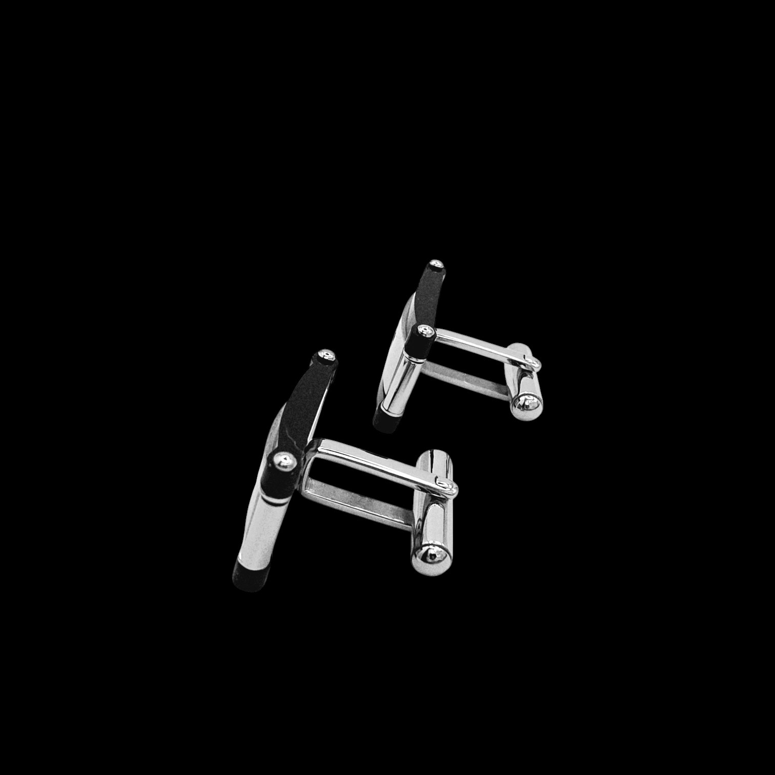 Crafted from 316 marine-grade stainless steel, these cufflinks are designed for strength, durability, and elegance. The slightly curved rectangular design is framed with black onyx accents, giving them a bold, modern contrast. At the center, each cufflink features a finely set black diamond, adding a subtle touch of luxury.