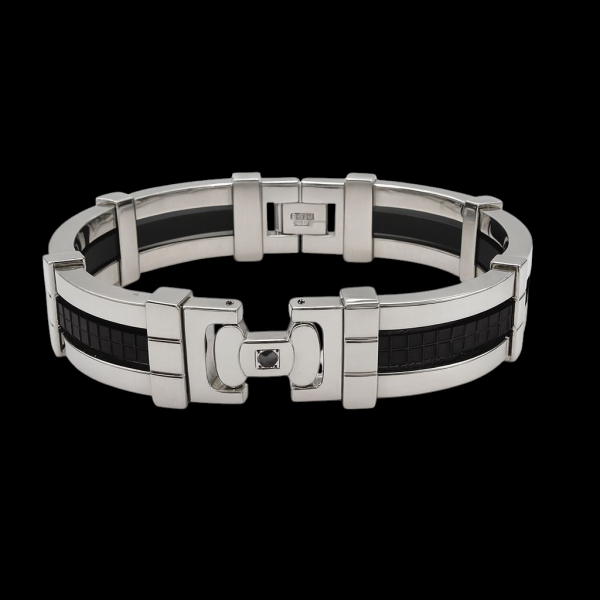 Elevate your style with this 316L stainless steel men’s bracelet, crafted with precision for the modern, confident man. Featuring dual black textured rubber inlays framed by polished steel links, this bracelet blends strength with sophistication. The centerpiece showcases a Black Diamond with a sleek, industrial design, ensuring durability and comfort for daily wear. Elegance, making it a signature piece from the hotsteel Collection. Perfect for both casual and formal occasions, this bracelet embodies bold craftsmanship and modern.