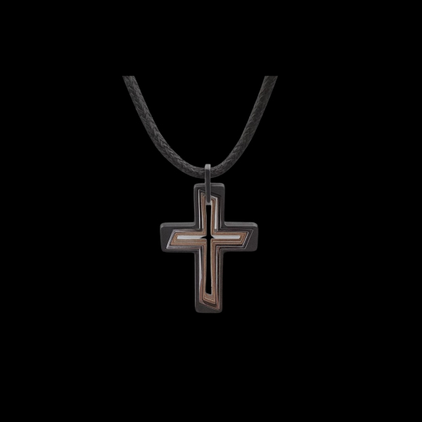 This contemporary men’s cross pendant combines bold design with refined craftsmanship. Made from marine grade 316 stainless steel, hotsteel Collection features a matte black outer frame contrasted by sleek steel and rose-gold layered accents that add depth and sophistication. Paired with a durable black Japanese cotton card, this pendant embodies strength, faith, and modern style perfect for both casual and formal wear. Its polished edges and clean lines make it a timeless accessory for the modern man.